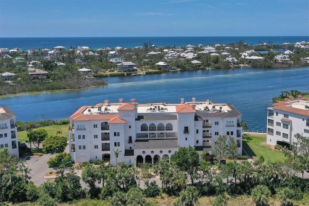 Exceptional corner, third-floor residence in a prime waterfront setting at the coveted Hacienda Del Mar community. This 3-bedroom, 2.5-bath condominium is ideally situated over the boat basin, offering expansive Intracoastal Waterway views and breathtaking sunset vistas over the Gulf. In mint condition, this light-filled, airy home features countless windows and glass sliders that seamlessly bring the coastal surroundings indoors. Built to rigorous coastal construction standards, Hacienda Del Mar offers impact-resistant Andersen windows and sliders along with a poured tie-beam structure for peace of mind. Premium interior features include beautiful tile flooring, stone countertops, custom wood cabinetry, dual walk-in closets, crown molding, 10-foot ceilings, 8-foot solid-core doors, and a wide-open floor plan ideal for entertaining. The spacious screened main lanai is equipped with motorized storm shutters and a superb outdoor kitchen complete with grill, sink, and beverage cooler?perfect for enjoying nautical views in comfort. An additional terrace is accessed from both guest bedrooms, providing even more outdoor living space. The stunning gated community offers resort-style amenities including two swimming pools, spa, pickleball and tennis courts, fitness center, day boat slips, two clubhouses, and 23 acres of beautifully maintained tropical landscaping. Ideally located near three full service marinas, Hacienda Del Mar offers boaters instant access to world-class fishing and boating waters, and is close to essential shopping, private and public golf courses, and offers easy access to the serene beaches of Palm Island and historic Gasparilla Island.